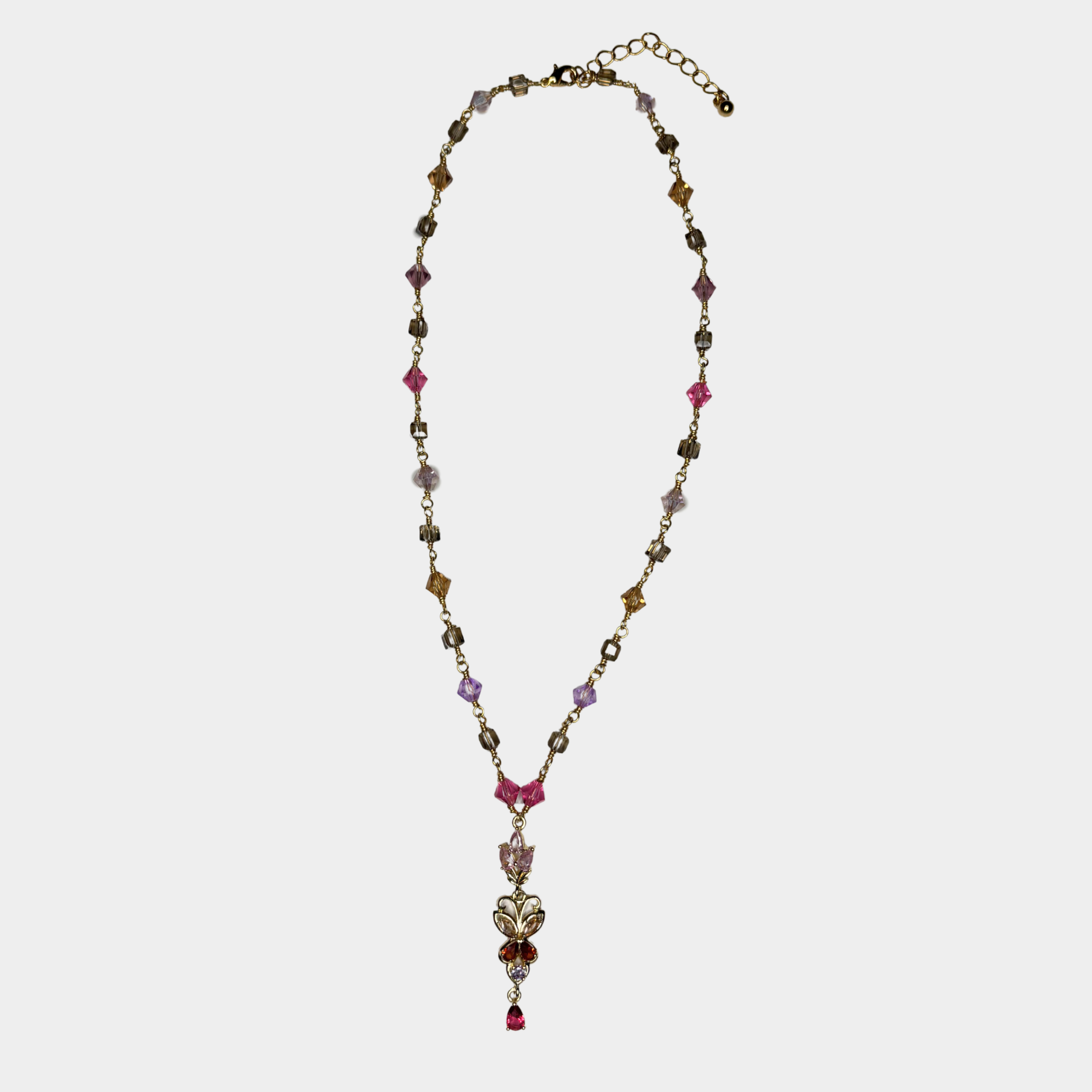 Handmade necklace made with non tarnish wire, clasp, and chain extension mixed with pink, grey, purple, brown and light pink dust glass crystal beads paired with a butterfly colored glass crystal drop pendant.
