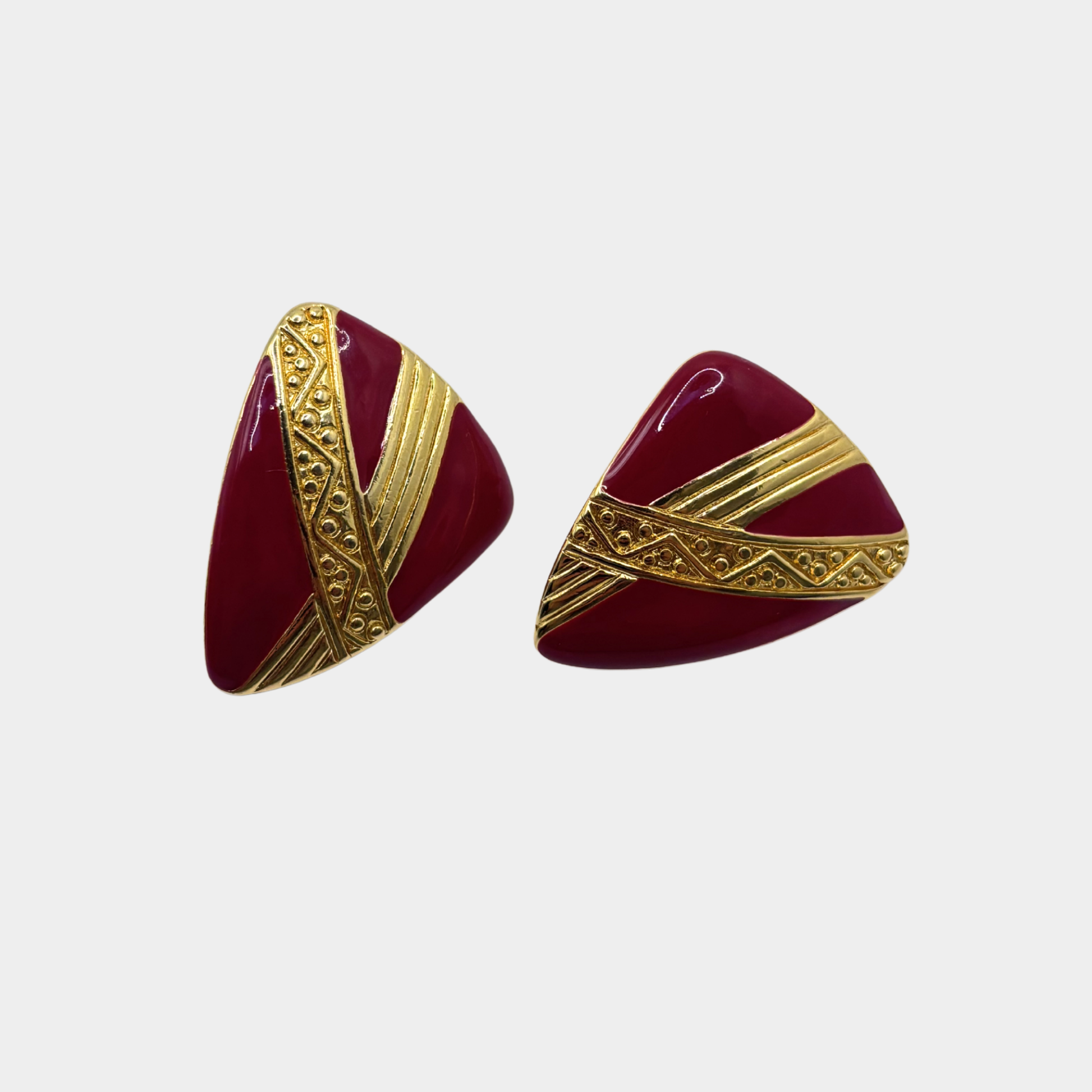 Crimson enamel intersected by intricately detailed gold-tone bands, creating depth and dimension. The layered design lends a sense of quiet opulence, enhanced by a smooth, light-reflective surface.